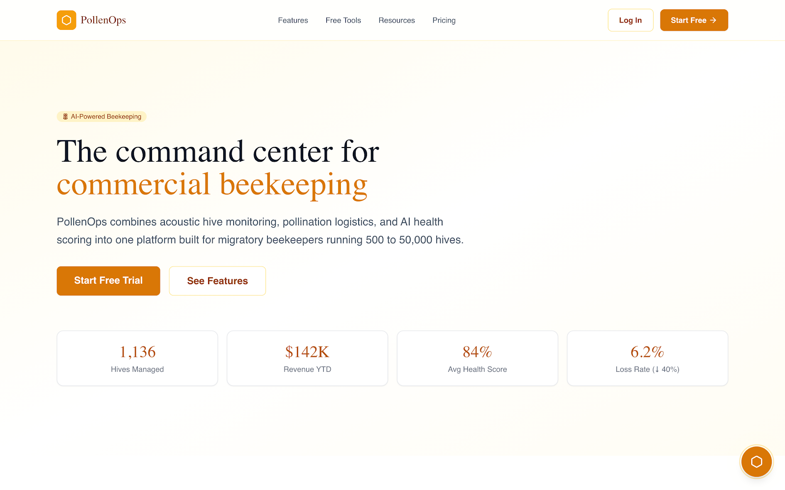 PollenOps, available at https://pollenops.com, is a software platform designed to help commercial beekeepers manage multi-state apiary operations, pollination logistics, hive health monitoring, and honey production planning from a centralized system.