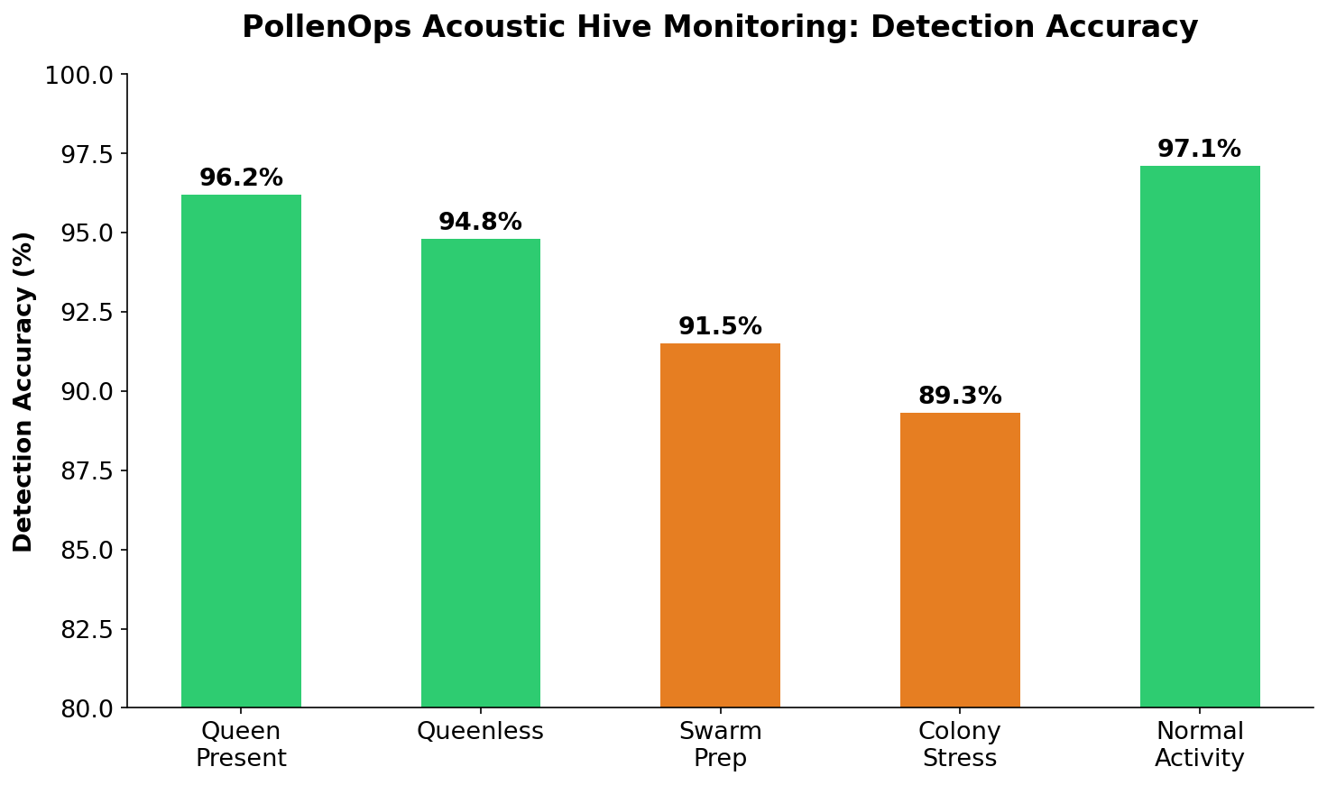 One of the platform’s most distinctive features is its acoustic hive monitoring system. Using machine learning models built with TensorFlow and trained on large datasets of hive audio recordings, the system analyzes the sounds produced by bee colonies to identify behavioral signals that may indicate changes in colony status.